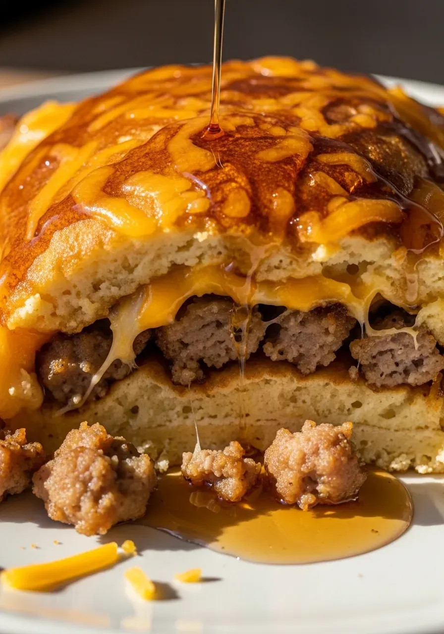 - 6. Top with Batter: Carefully pour the remaining pancake batter over the cheese and sausage. Gently spread it to cover.