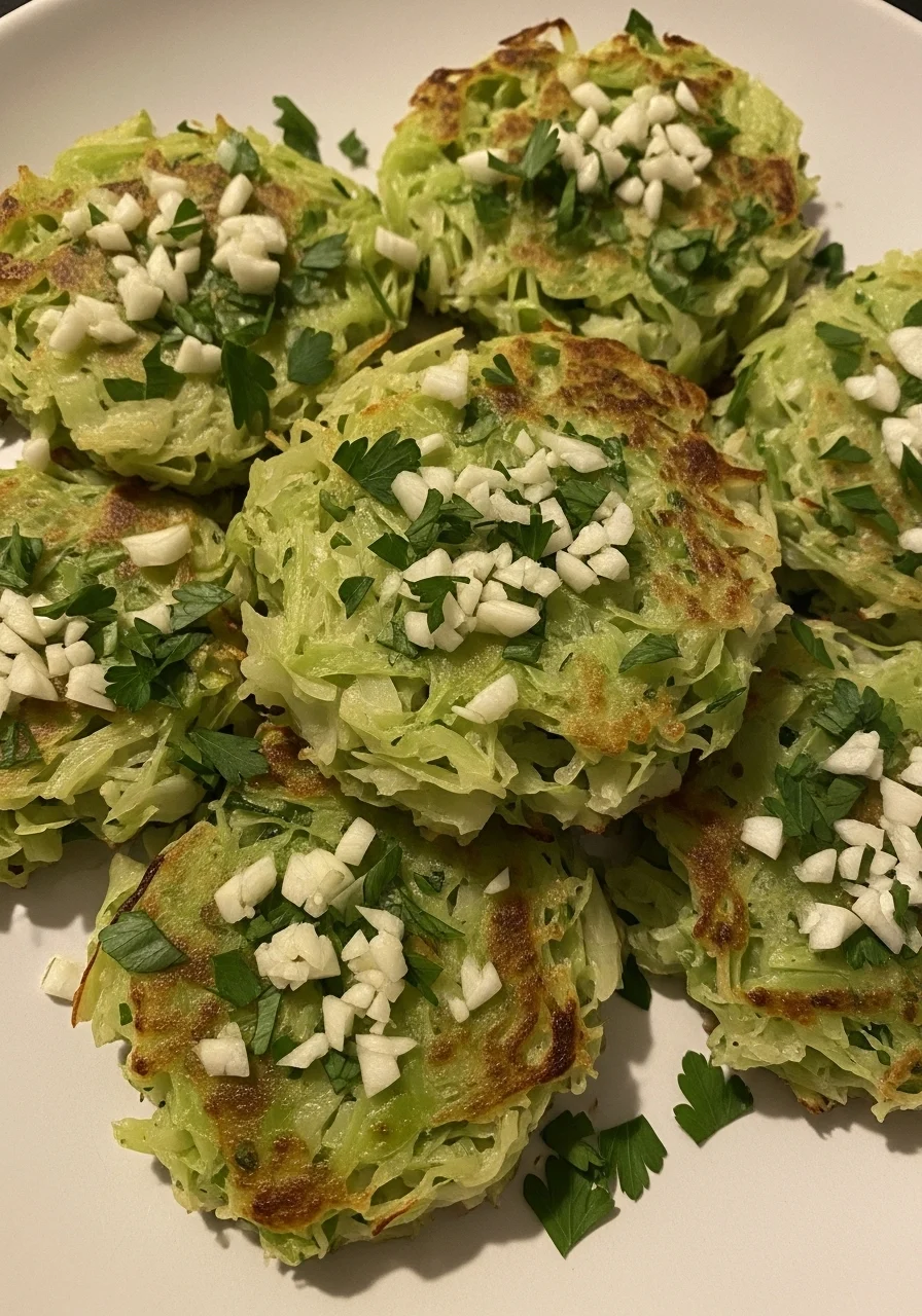 7. Serve: Remove the cooked cakes from the skillet. Place them on a paper towel-lined plate to drain excess oil. Serve immediately. Enjoy your delicious Irresistible Cabbage and Garlic Cakes!