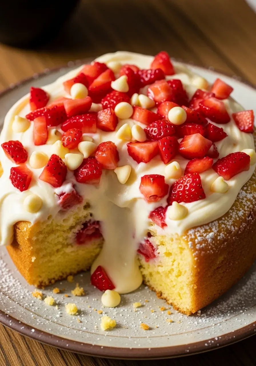 - Assemble: Drop spoonfuls of the cream cheese mixture evenly over the cake batter. Sprinkle diced strawberries and white chocolate chips (if using) over the top.